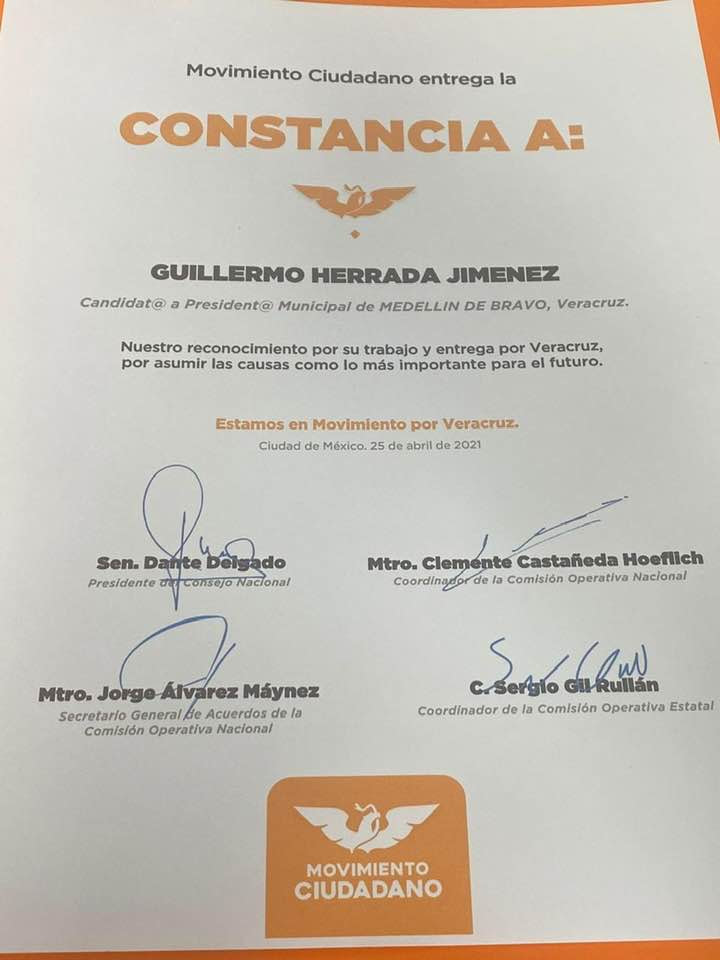 Coatepec, Veracruz. 25 abril 2021.- La tarde de este domingo, Guillermo Herrada Jiménez, tomó protesta como candidato a Presidente Municipal de Medellín de Bravo, abanderado por Movimiento Ciudadano.