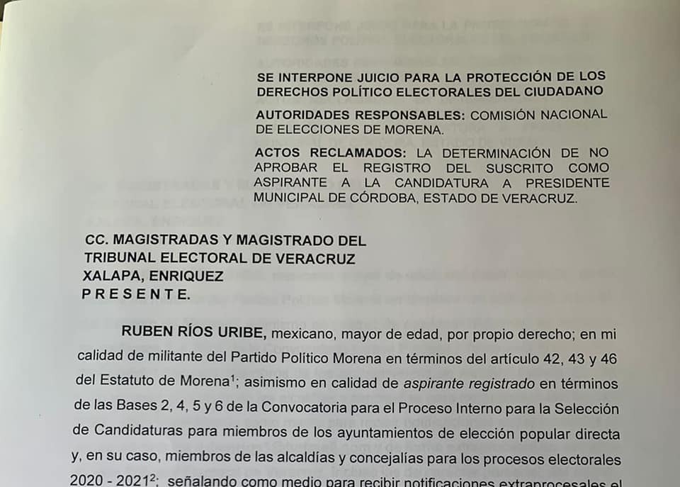 Xalapa, Veracruz.- El ex Presidente del Estado de Veracruz y militante de Morena, Rubén Ríos Uribe, acudió ante el Tribunal Electoral de Veracruz (TEV), y presentó Juicio para la Protección de los Derechos Políticos Electorales, en contra del dictamen de la Comisión Nacional de Elecciones de Morena, por falsificación de datos de Juan Martínez Flores, quien no es militante del Movimiento de Regeneración Nacional ya que no aparece en el Registro Nacional Electoral del INE, como militante activo de MORENA.