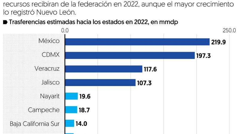 El Proyecto de Presupuesto de Egresos de 2022 anticipa que el gasto federalizado por primera vez rebasará los dos billones de pesos, donde los estados con mayor incremento en recursos figuran Nuevo León, Querétaro y Chihuahua, destacaron analistas.Lucía Cárdenas, directora de Estudios Económicos de Citibanamex, afirmó en entrevista, que la bolsa grande de todo lo que se repartirá a los estados que incluye participaciones, aportaciones, subsidios y fondos de salud, sumará un máximo histórico de 2.109 billones de pesos en 2022 y representará un incremento de 4.7 por ciento real anual, respecto a lo aprobado en 2021.Emmanuel Ramírez, investigador en el Programa de Justicia Fiscal de Fundar, agregó que otro récord se registrará en el monto de participaciones a los estados y municipios del país que sumará 1.019 billones de pesos.Precisó que en el agregado de todo lo que es el gasto federalizado, los estados recibirán incrementos reales en el reparto de la bolsa de recursos federales, aunque los porcentajes de aumento variarán, donde las entidades que resultarán ganadoras serán: Nuevo León con un incremento de 11.12 por ciento; Querétaro 10.51 por ciento; Chihuahua 7.79 por ciento; Guanajuato 7.53 y Michoacán con 7.48 por ciento.