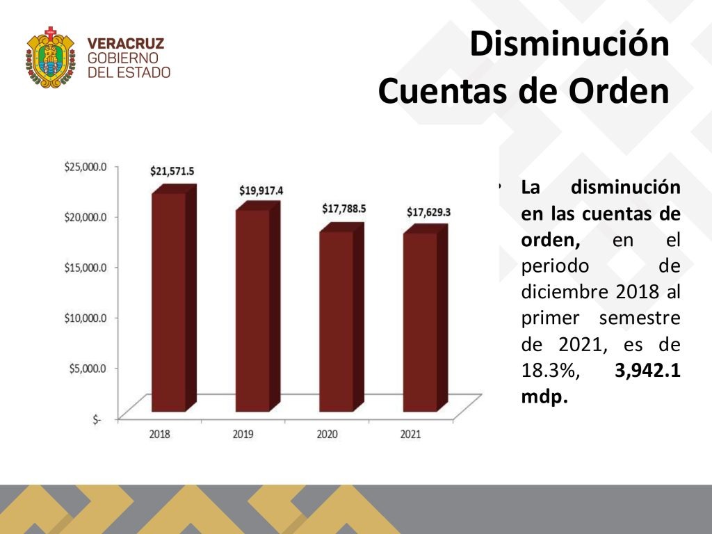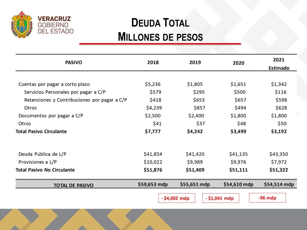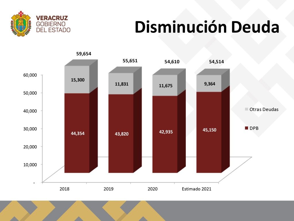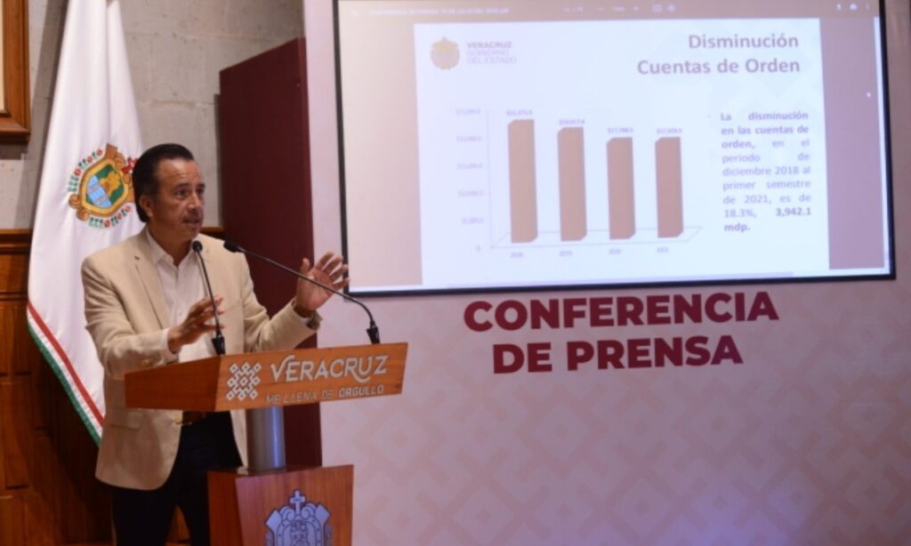 En conferencia de prensa, el gobernador Cuitláhuac García Jiménez reveló que durante su administración se crearon estrategias para la disminución de la deuda que se viene arrastrando desde el sexenio de Miguel Alemán Velasco y se agudizó con préstamos bancarios solicitados durante los sexenios de Fidel Herrera Beltrán y Javier Duarte de Ochoa, y pasando por el bienio de Miguel Ángel Yunes Linares sin ninguna reducción.