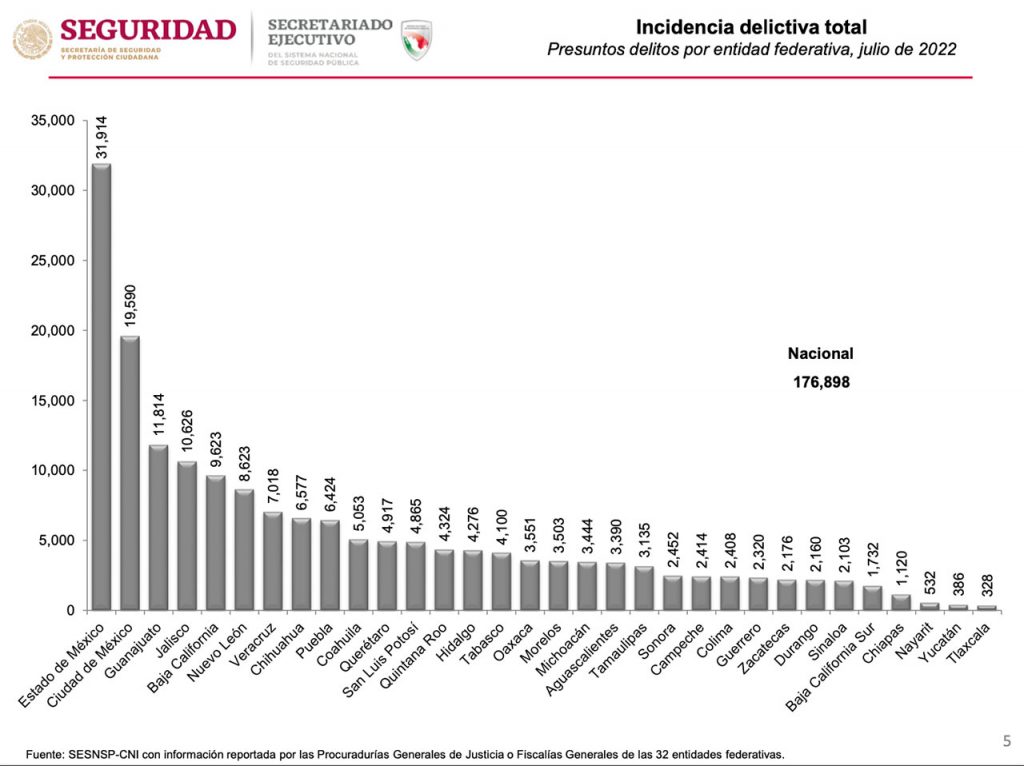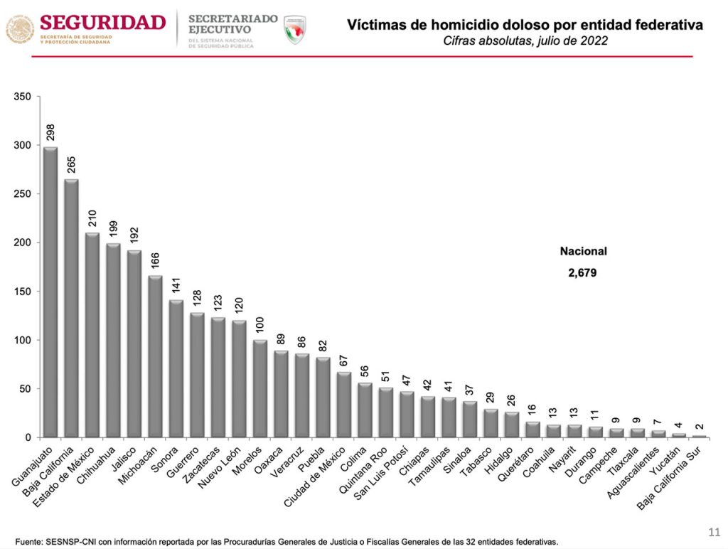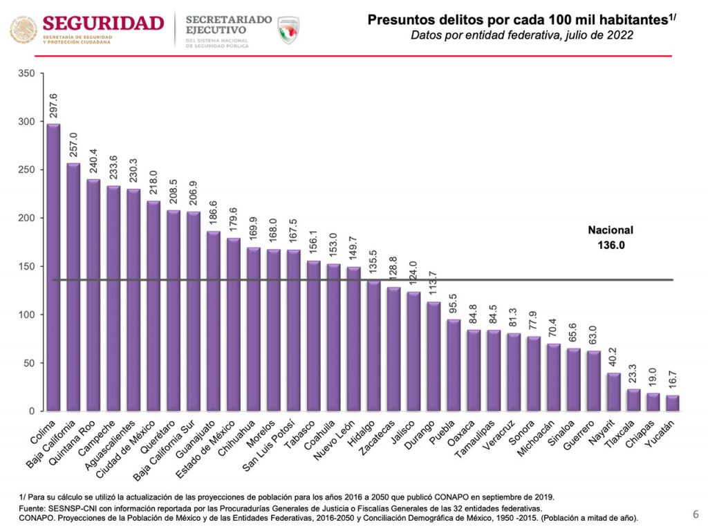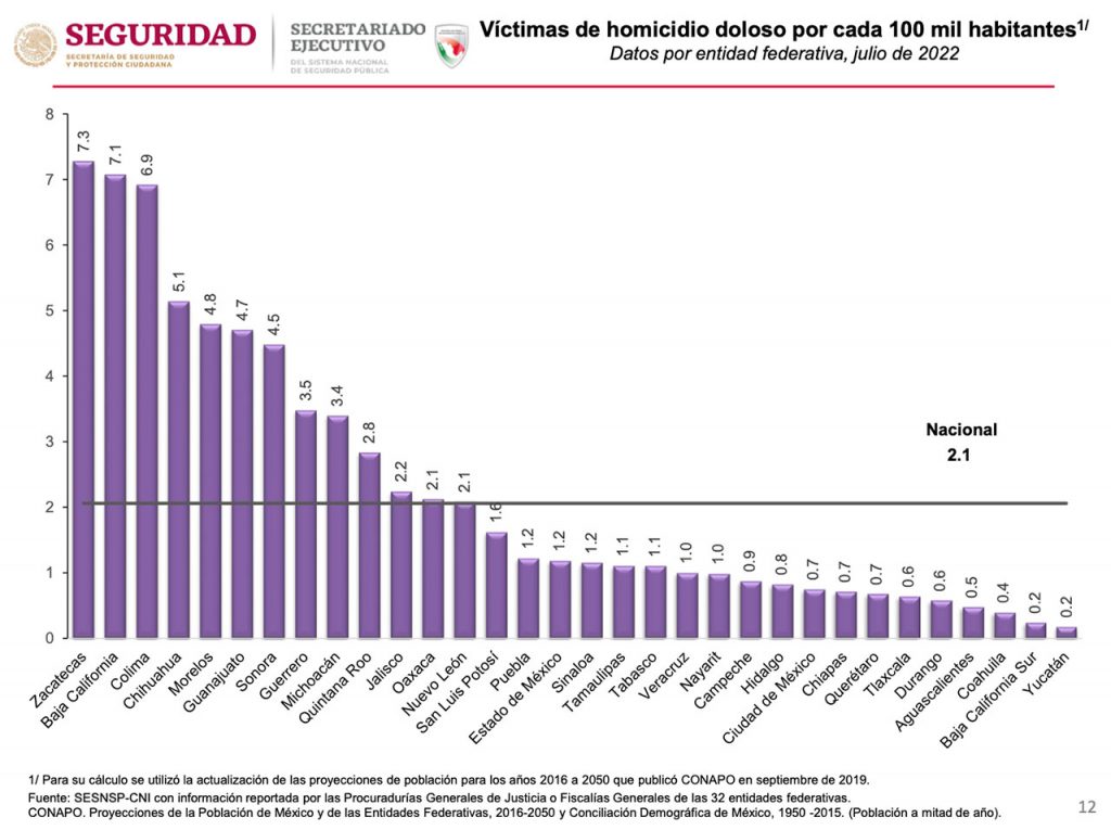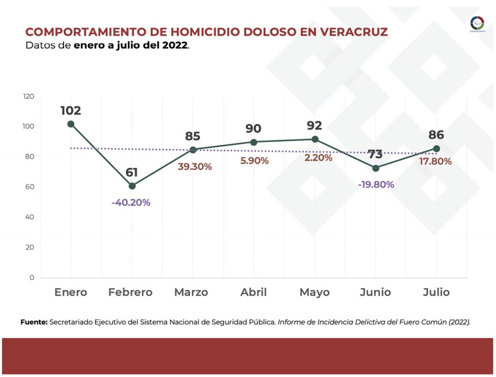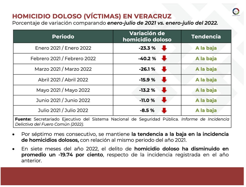 En el caso del homicidio doloso, resaltó que la tasa de homicidio doloso por 100 mil habitantes es muy baja en comparación a la media nacional que fluctúa entre 1.7 y 2.2%; en el caso de Veracruz, se alcanzó entre enero y julio de 2022 entre 0.7 a 1.1 por ciento.