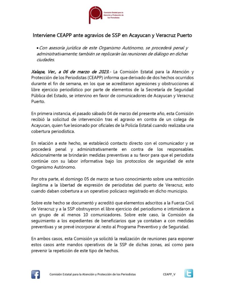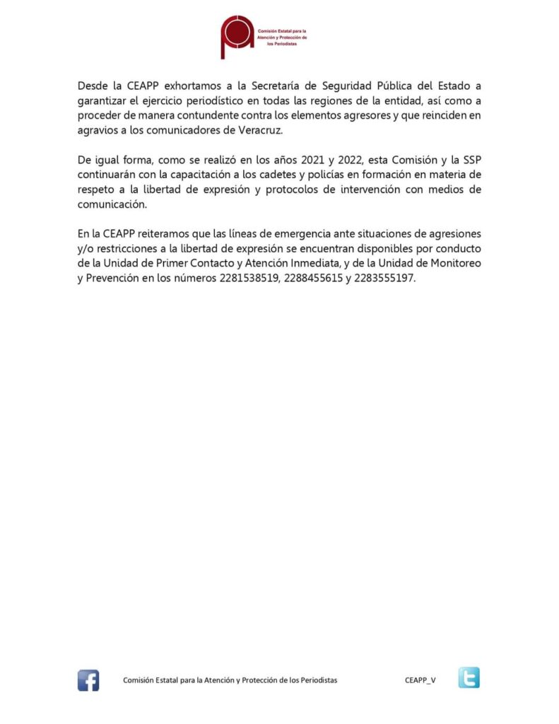 Desde la CEAPP exhortamos a la Secretaría de Seguridad Pública del Estado a garantizar el ejercicio periodístico en todas las regiones de la entidad, así como a proceder de manera contundente contra los elementos agresores y que reinciden en agravios a los comunicadores de Veracruz.