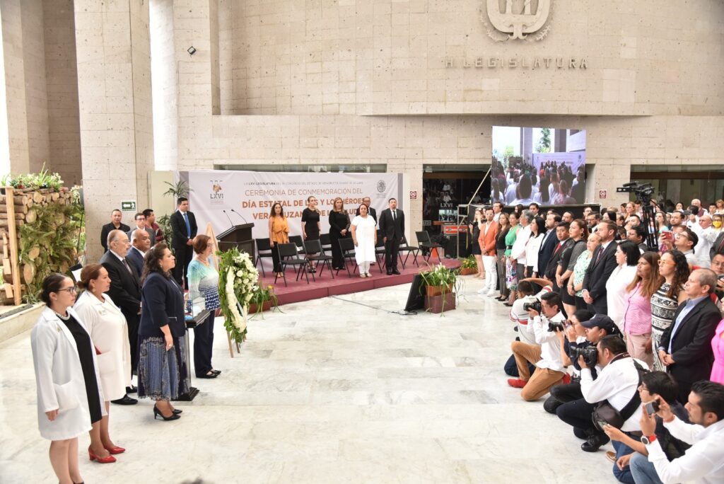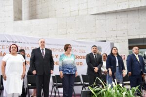 En un acto celebrado en la explanada del Palacio Legislativo, la presidenta de la Mesa Directiva de este Congreso, diputada Margarita Corro Mendoza; el presidente de la Junta de Coordinación Política, diputado Juan Javier Gómez Cazarín; las diputadas Adriana Esther Martínez Sánchez, Cecilia Josefina Guevara Guembe y Nora Jéssica Lagunes Jáuregui; la presidenta del Poder Judicial del estado, magistrada Lisbeth Aurelia Jiménez Aguirre; el secretario de Gobierno, Eric Cisneros Burgos; el secretario de Salud, Gerardo Díaz Morales, presentaron una ofrenda floral, montaron guardia de honor y guardaron un minuto de silencio.