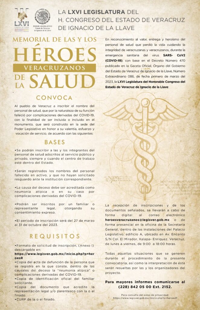 La diputada Nora Jessica Lagunes Jáuregui, autora de la iniciativa, dijo que ya existe una convocatoria para inscribir las y los integrantes del personal veracruzano de la salud adscritos al servicio público y privado, siempre y cuando el centro de trabajo esté dentro del estado, que hayan perdido la vida en activo y no hayan solicitado resguardo ante la institución correspondiente.