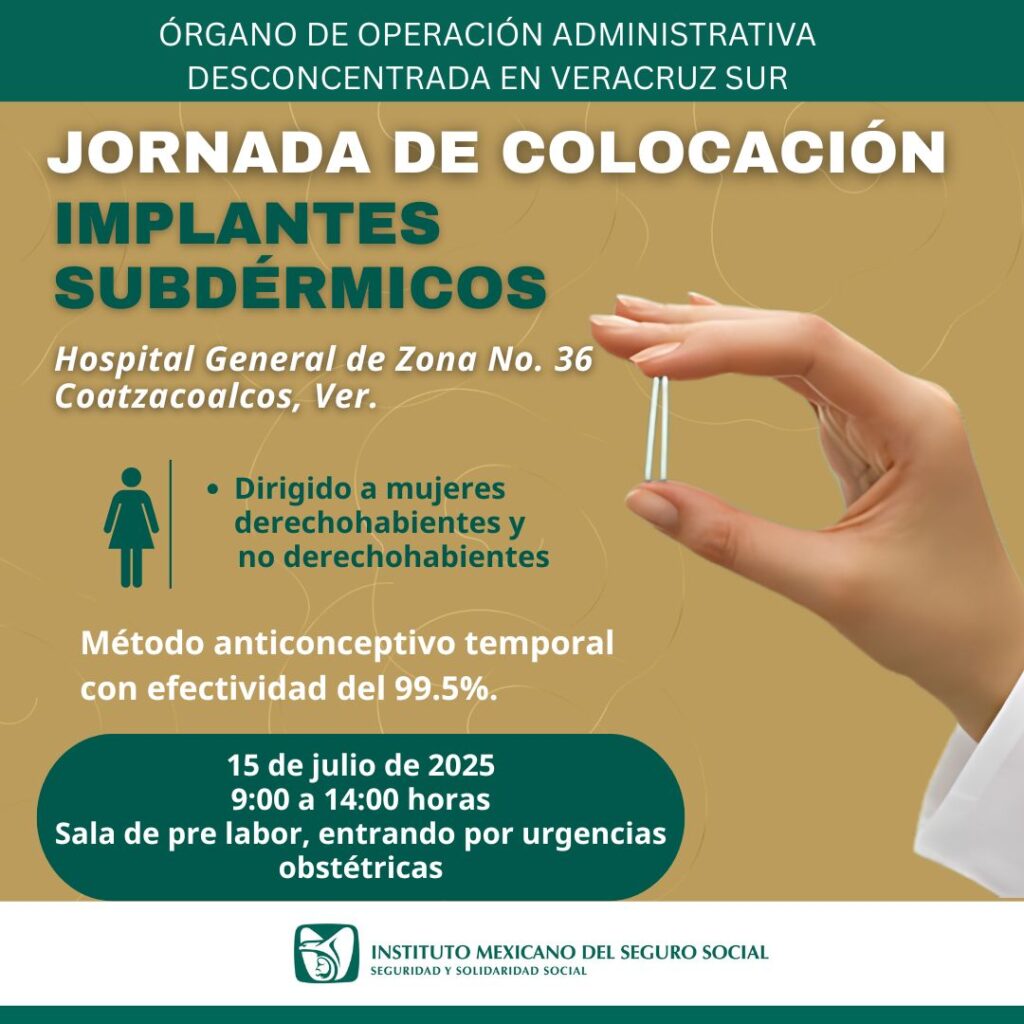 El 15 de julio, en el Hospital General de Zona (HGZ) No. 36 del Instituto Mexicano del Seguro Social (IMSS) en Veracruz Sur realizará la Jornada de Colocación de Implantes Subdérmico a población femenina derechohabiente y no derechohabientes, a partir de las 9:00 y hasta las 14:00 horas.
