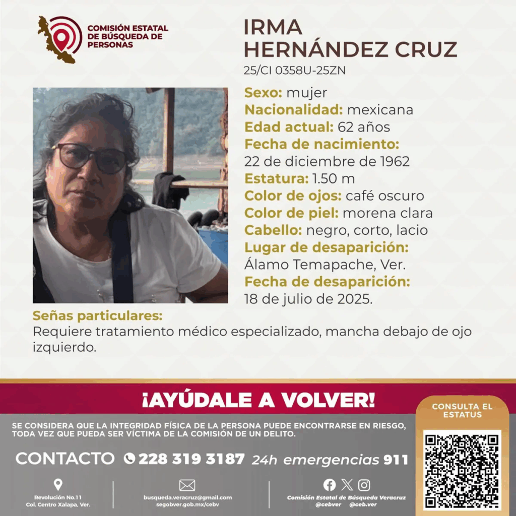 La Comisión Estatal de Búsqueda de Veracruz emitió un boletín solicitando la colaboración de la ciudadanía para localizar a Irma Hernández Cruz. En el comunicado se incluyen números telefónicos y correos de contacto para brindar cualquier información que pueda ayudar a dar con su paradero.