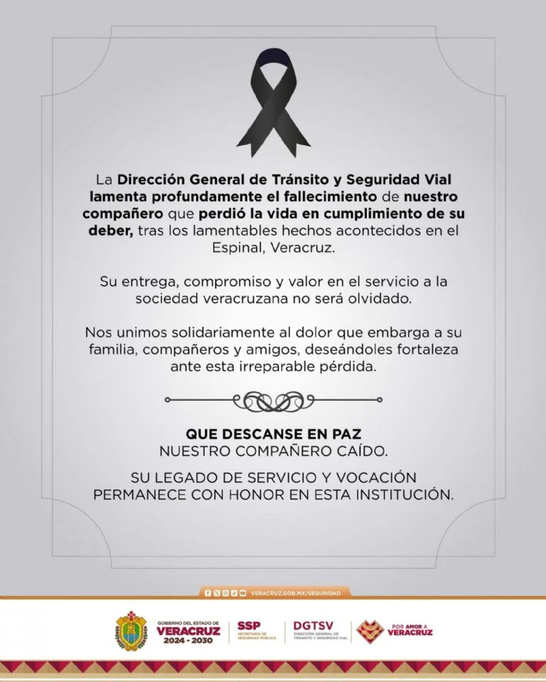 Junto con la imagen comparten: “La Secretaría de Seguridad Pública del Estado de Veracruz y nuestro personal, lamenta con profundo pesar la pérdida del compañero de Tránsito Estatal que perdió la vida hoy, en cumplimiento de su deber. A su familia y amigos, les externamos nuestra solidaridad y respeto. En Paz Descanse.”