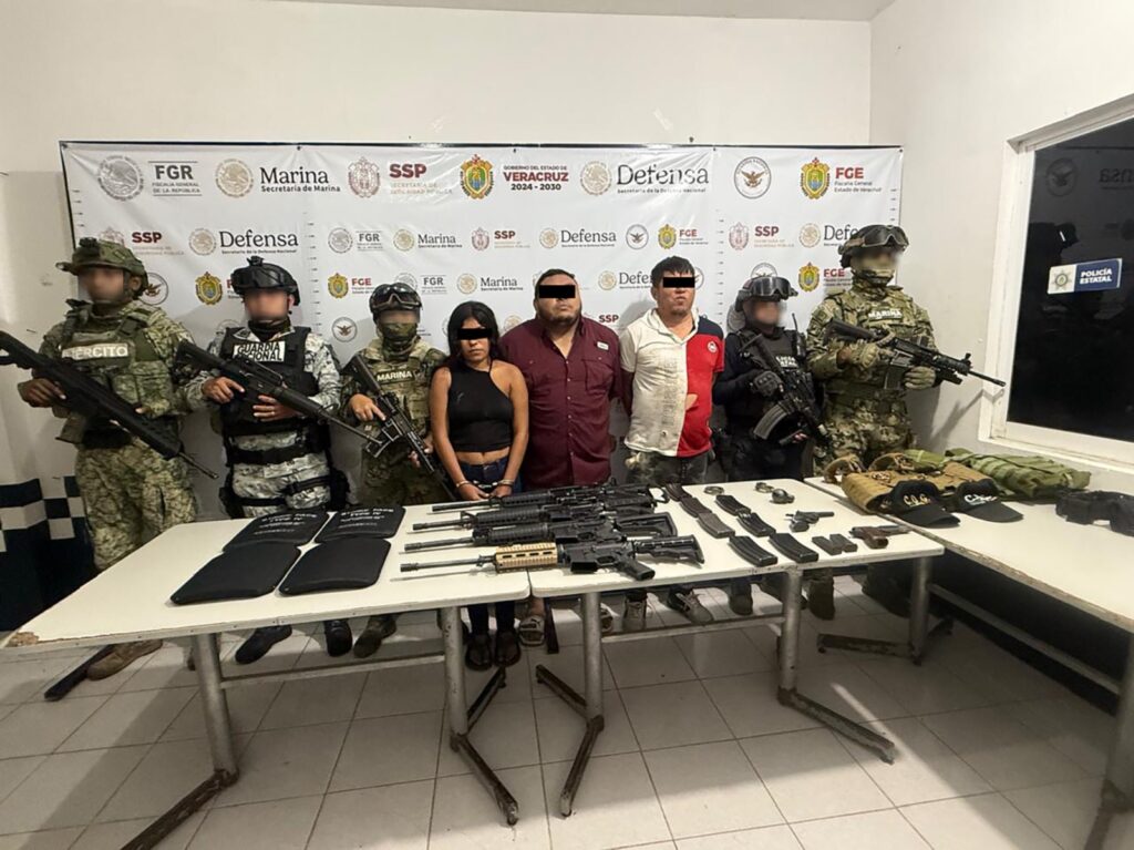 Asimismo, en Pánuco, se aprehendió a tres personas, entre ellas una mujer, a quienes les fue asegurado armas de fuego largas y cortas, una granada de fragmentación, cargadores, chalecos tácticos, placas balísticas y aros aprehensores, así como gorras con leyenda alusiva a un grupo delictivo.