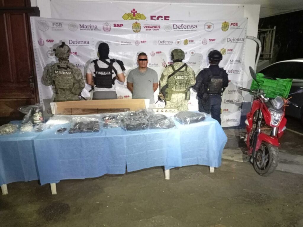 En cumplimiento a una orden de cateo ejecutada por la Fiscalía General del Estado en el municipio de Coxquihui, se detuvo a una persona, decomisándose nueve artefactos explosivos de fabricación casera, un dron, un chaleco táctico, documentos personales y una motocicleta.