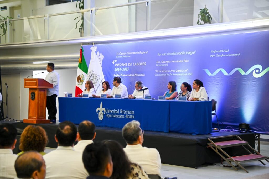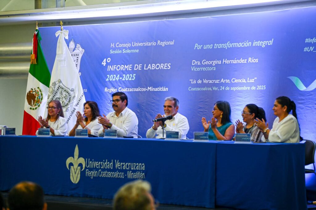 Durante el Cuarto Informe de Labores que presentó la vicerrectora en sesión solemne ante el Consejo Universitario Regional, y que estuvo presidido por el rector de la UV, Dr. Martín Gerardo Aguilar Sánchez, el alcalde subrayó que la máxima casa de estudios sigue creciendo con visión, responsabilidad y compromiso social.