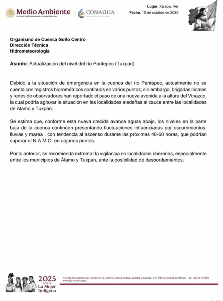 El Organismo de Cuenca Golfo Centro de la Comisión Nacional del Agua (CONAGUA) informó sobre una nueva crecida en la cuenca del río Pantepec, que podría agravar la situación en localidades cercanas al cauce entre los municipios de Álamo y Tuxpan.