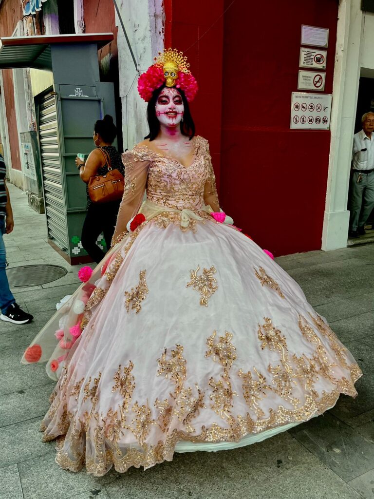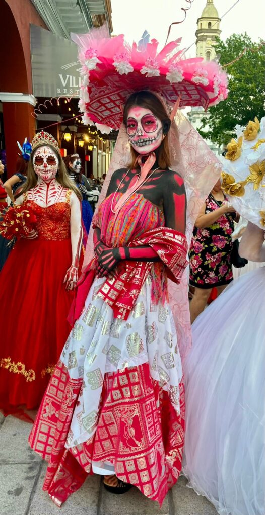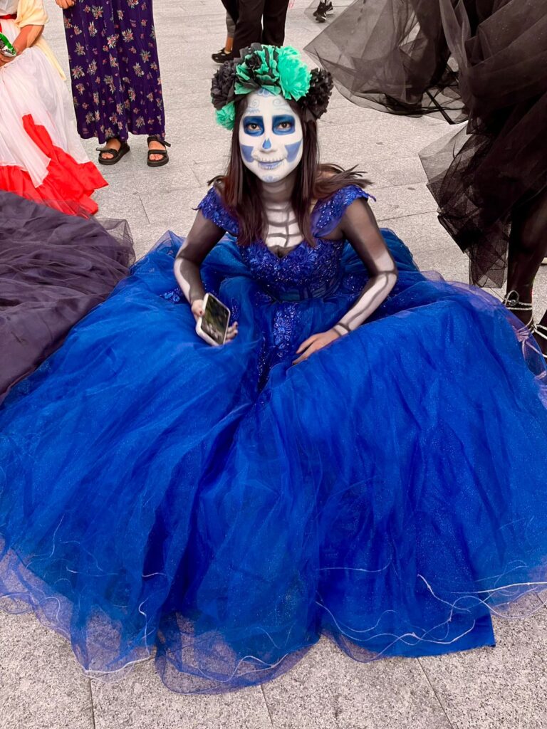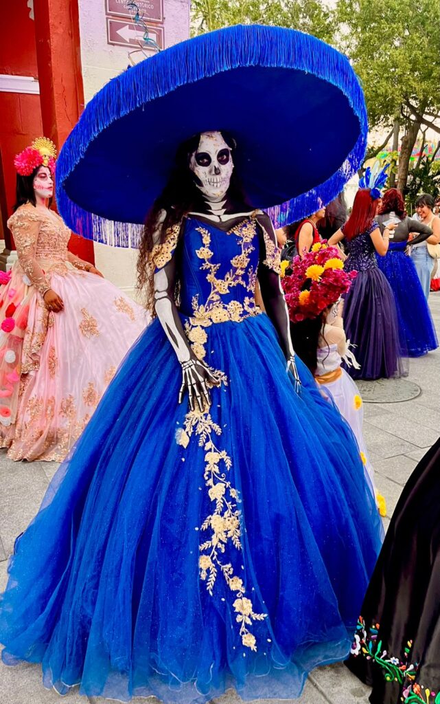 En cada paso, la estética del desfile se fundió con la mística del camino al Mictlán —el viaje al inframundo en la cosmovisión mexica—, como si estas mujeres, entre la vida y la muerte, caminaran en procesión hacia el recuerdo eterno.