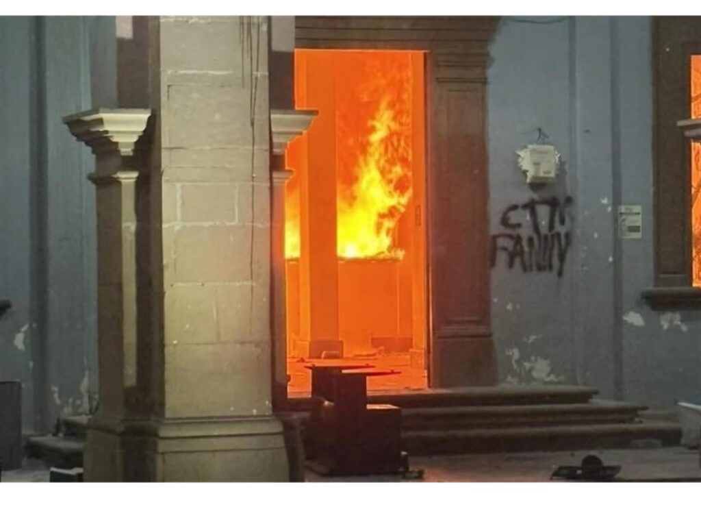 En medio de la ola de protestas por el asesinato de Carlos Manzo, manifestantes vandalizaron y quemaron el Palacio Municipal de Apatzingán, en Michoacán. Crédito: Especial