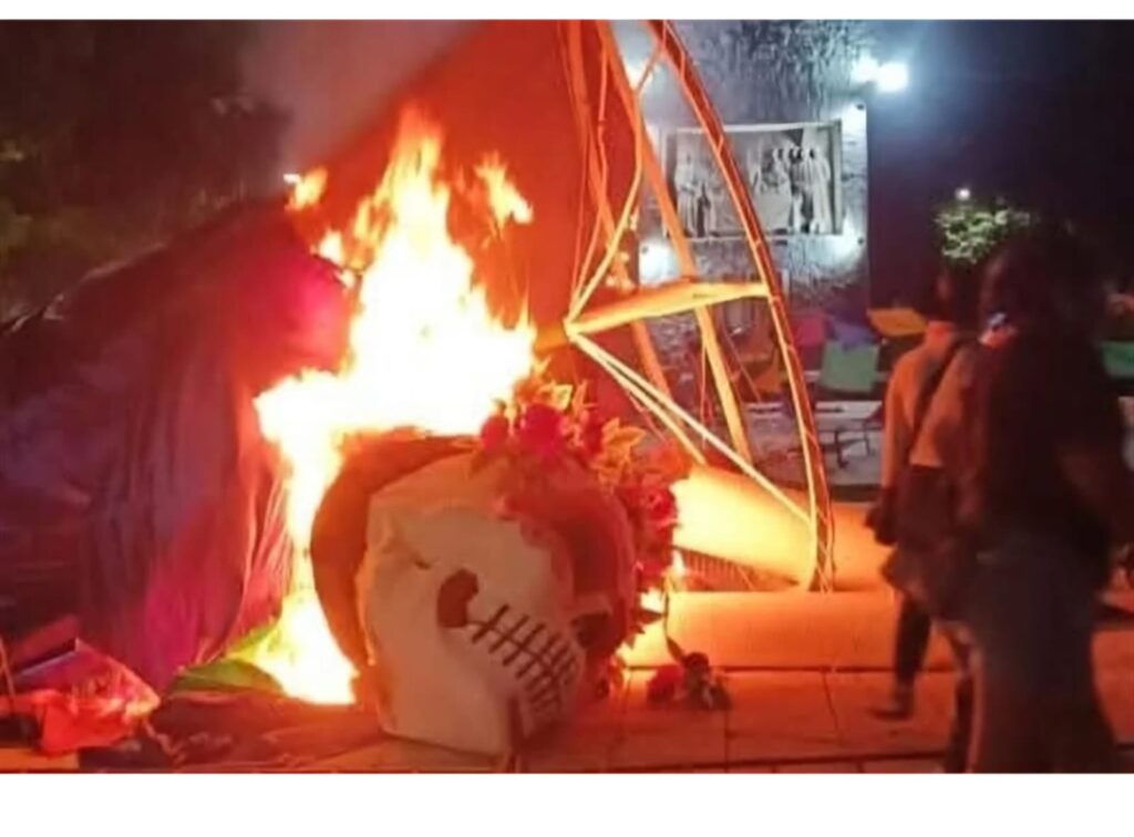 Los manifestantes también prendieron fuego a distintas ofrendas y adornos alusivos al Día de Muertos colocados en la plaza principal.