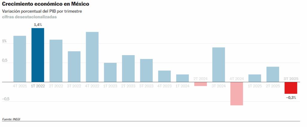México (elpaís.com)- El panorama para la economía mexicana luce sombrío. La junta de Gobierno del Banco de México (Banxico) redujo a la mitad la previsión de crecimiento del Producto Interno Bruto (PIB) para el cierre de 2025, desde un 0,6% estimado en agosto, hasta 0,3%. El rango ha caído a dos décimas porcentuales de su peor previsión, elaborada a mediados de año, y cuando se fijó en 0,1%.