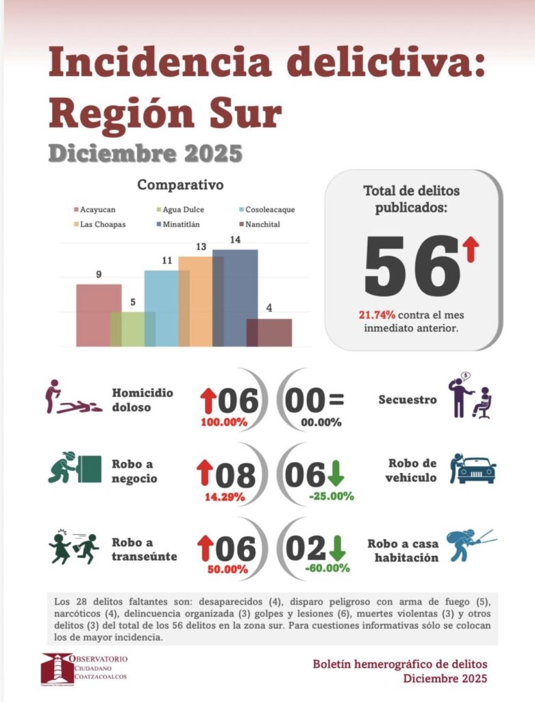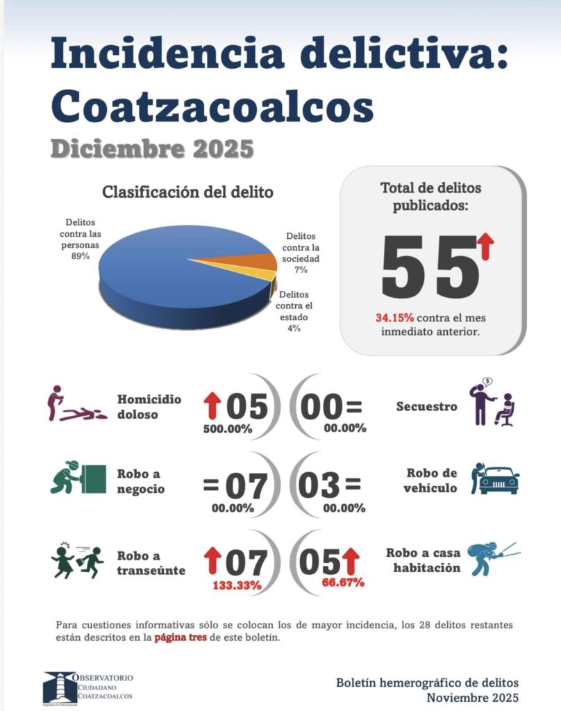 Coatzacoalcos cerró diciembre de 2025 como el municipio con mayor incidencia delictiva en la región sur de Veracruz, al contabilizar 55 delitos, lo que representó un incremento de 34.15 por ciento en comparación con noviembre, según el Boletín Hemerográfico de Delitos elaborado con información de medios regionales .