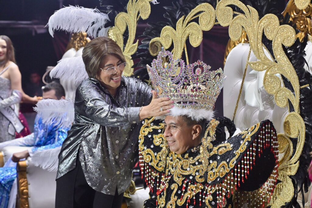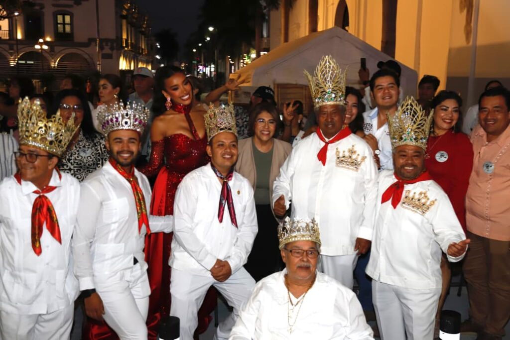 Ataviado con un majestuoso traje en tonos negros y dorados, “Nayo I” fue coronado por la alcaldesa de Veracruz, Rosa María Hernández Espejo, y recibió el cetro de la reina electa 2026, Fernanda Pumar, en un acto solemne que contó con la presencia de la secretaria de Cultura, Xóchitl Molina González.