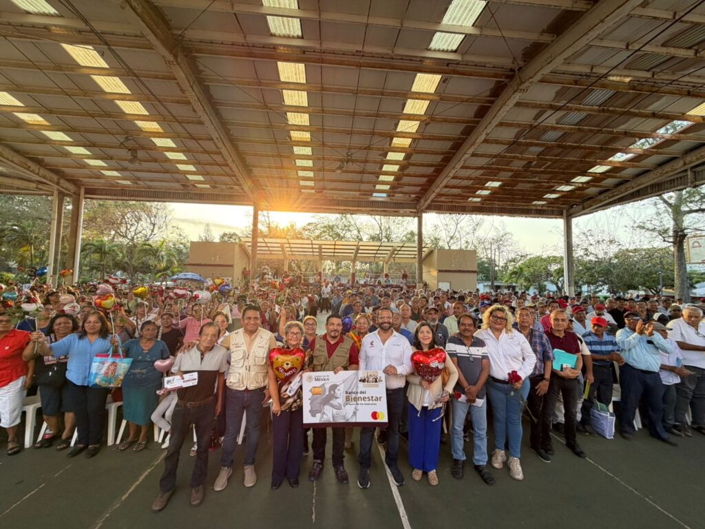 La jornada inició con la entrega de tarjetas de los programas Pensión para el Bienestar de las Personas Adultas Mayores y Pensión Mujeres Bienestar, en la cancha Margarita Maza de Juárez, donde se integraron 500 nuevos derechohabientes.